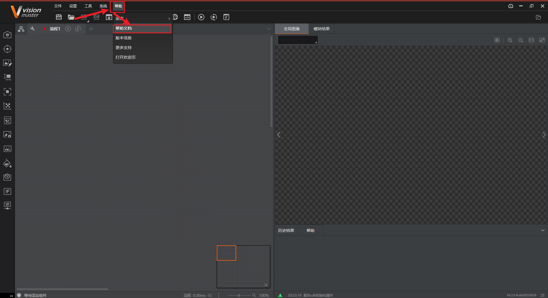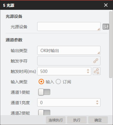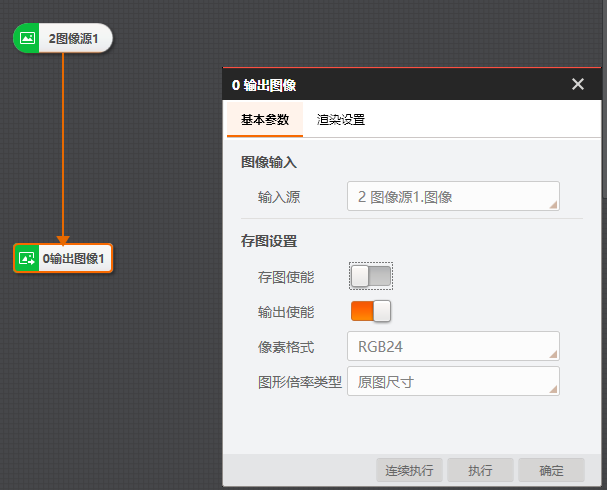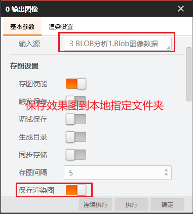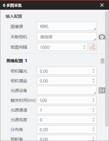 # 帮助文档  # 图像源  ## 方案存图 打开方案时是否保存图片 * 不勾选,如果图片丢失则项目运行失败 * 勾选,自动读取方案内的图片 ## SN初始值 类似于帧号,每加载一张图片则编号加1 ## 图片缓存+拼接使能 目前软件有bug,4.2版本尚未修复,新版本可能修复了。 # 多图采集 控制相机可以按照多种配置进行拍照,例如第一张曝光1000,第二张曝光2000,适合不稳定性检测和不稳定性识别。  # 输出图像  ## 存图使能 是否存储图片 ## 生成目录 是否自动创建文件夹 ## 同步存储 是否采用同步的方式存储 ## 保存渲染图  ## 启用FTP 是否将图像上传到客户的服务器上 # 缓存图像  有助于根据图片排查算法哪里出了问题。 但是视觉项目追求效率,如果不是特别大的项目,基本不用。 # 光源  ##