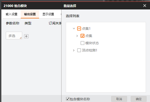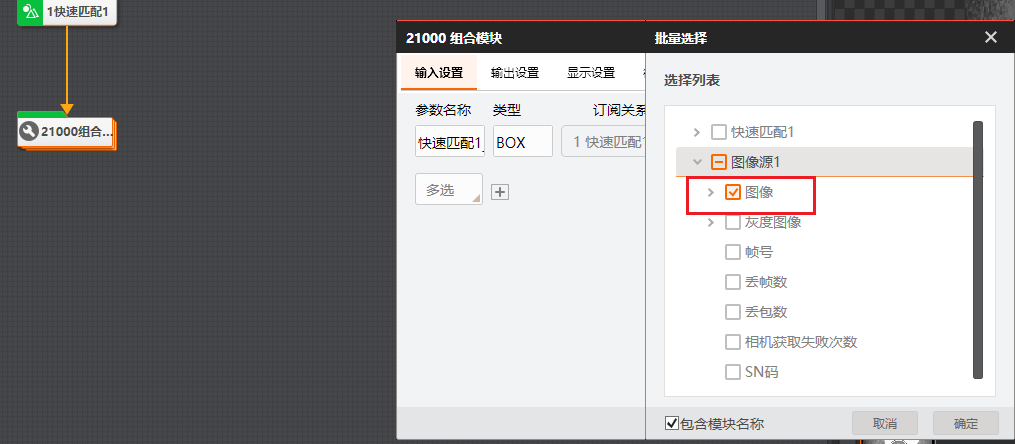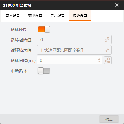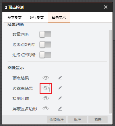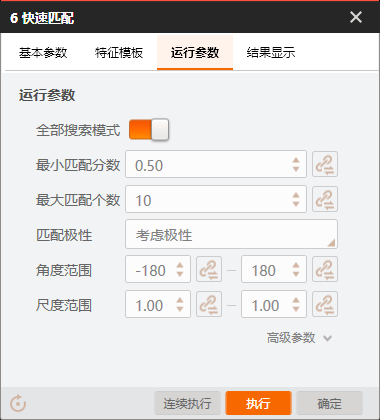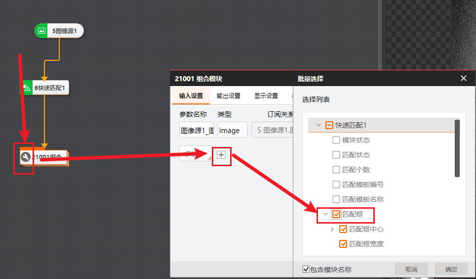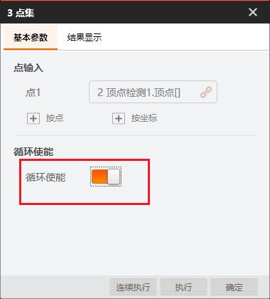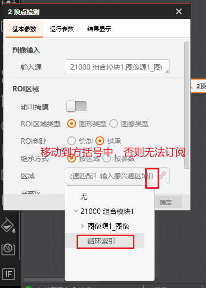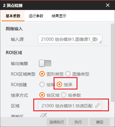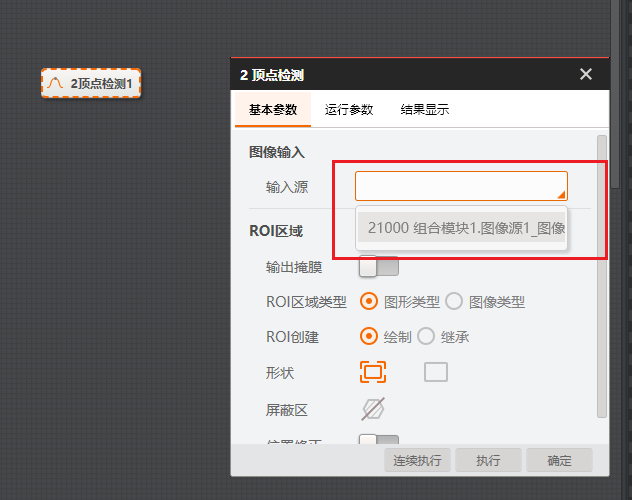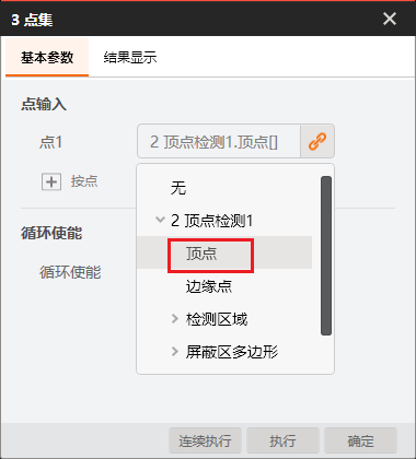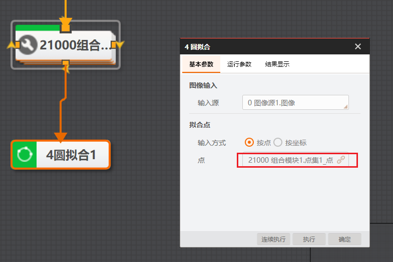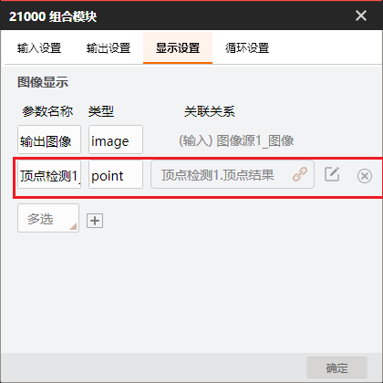 # 功能 * 在复杂方案中,利用Group模块进行整合,使方案界面显示更加清晰; * 兼容循环功能,实现Group所包含的模块循环执行。 # 参数 * 输入设置 * 输出设置 * 循环设置 # 示例 使用循环功能,查找工件的所有顶点,拟合出工件的外接圆。   ## 图像源 ## 快速特征匹配 * 选取一个突出作为特征模板  ## 循环检测顶点(Group模块) ### 添加匹配框  ### 添加图像源  # 顶点检测设置      # 点集模块 * 用于组合检测出的顶点       # 圆拟合