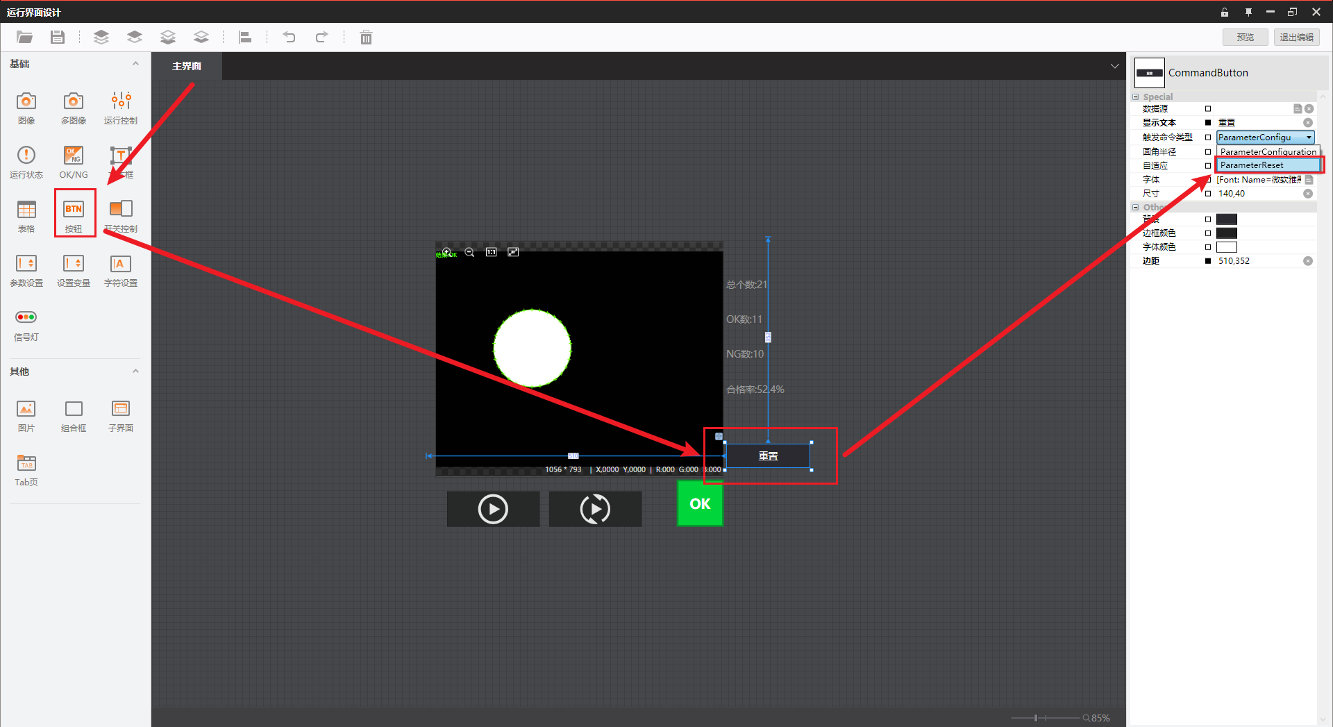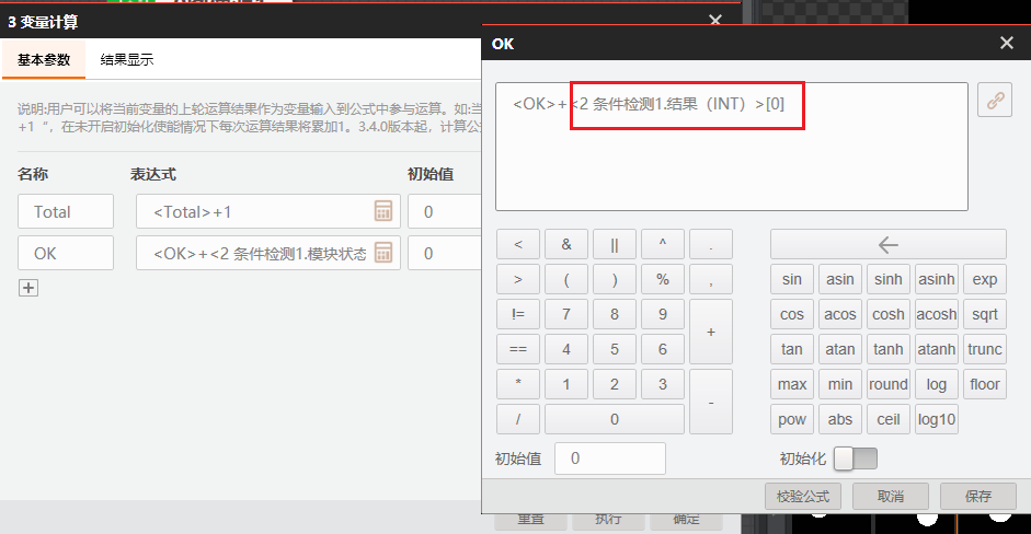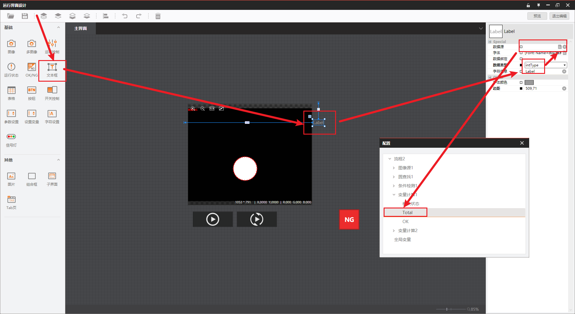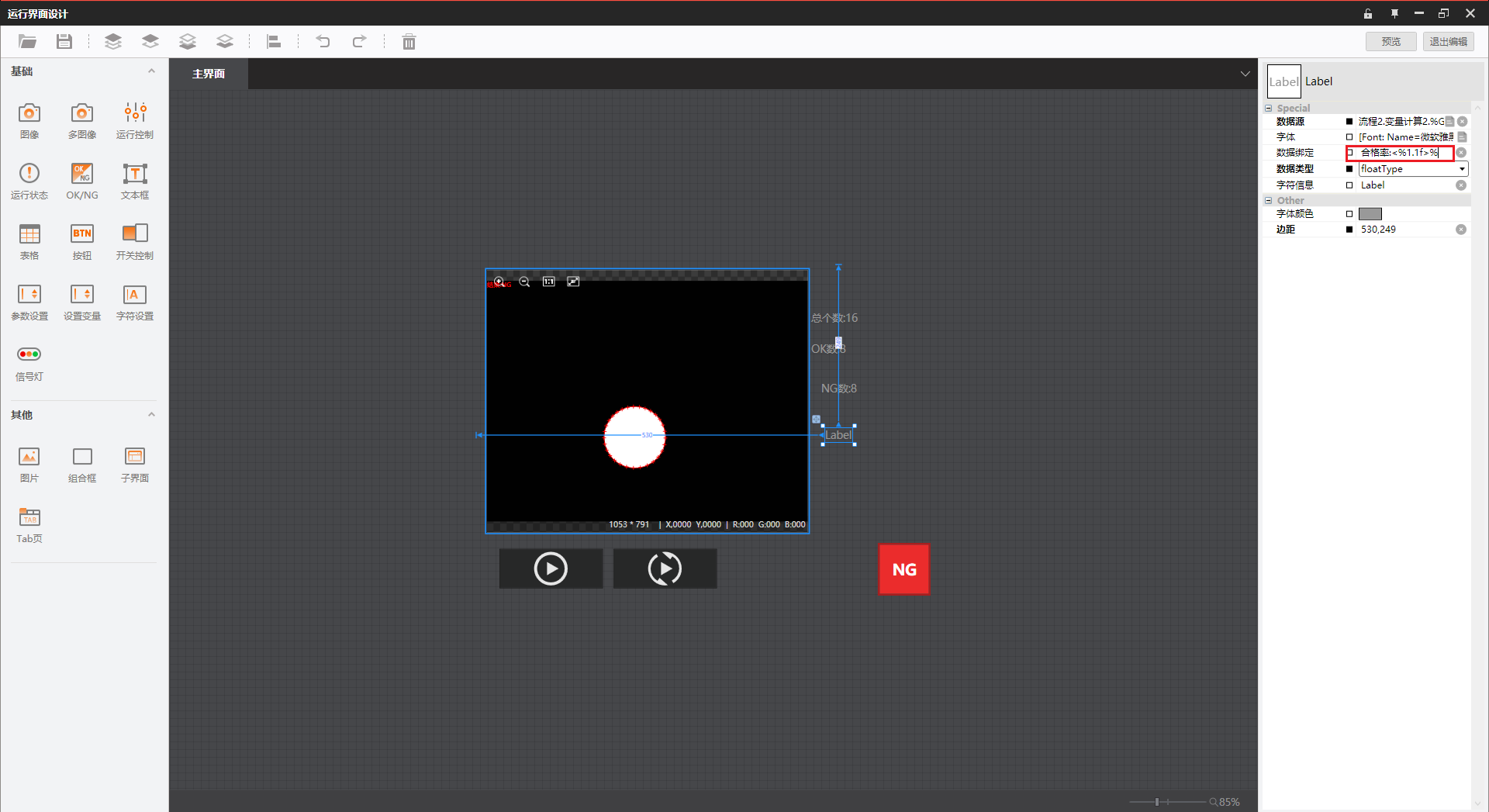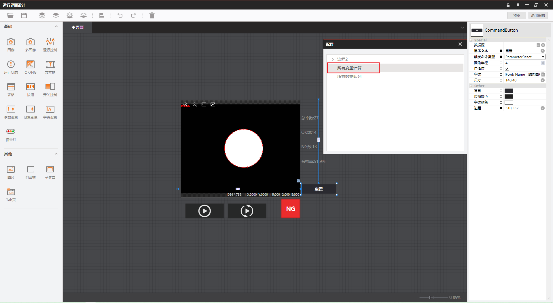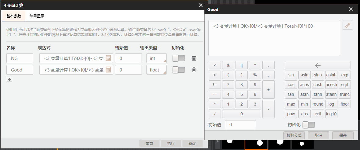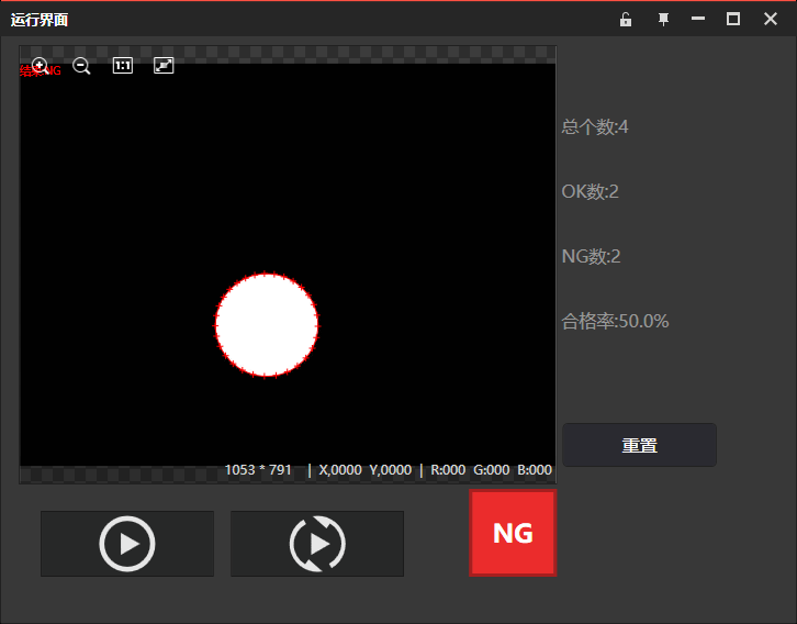 # 功能实现 对视觉方案运行的OK数和NG数进行计数和显示。 # 实现步骤 1. 根据需求搭建检测方案 2. 使用变量计算对OK、NG计数 3. 使用运行界面实时显示OK NG数 4. 重置运行界面上的OK NG数 # 示例 * 将方案执行的OK/NG数、检测数、合格率实时显示在运行界面上 * 根据生产需求,重置OK、NG数等。 # 预览  # 圆查找    # 条件检测  # 变量计算1   # 变量计算2    # 搭建界面  ## 编辑页面         # 效果图  # 导出
