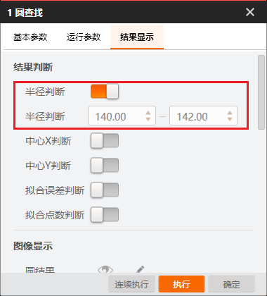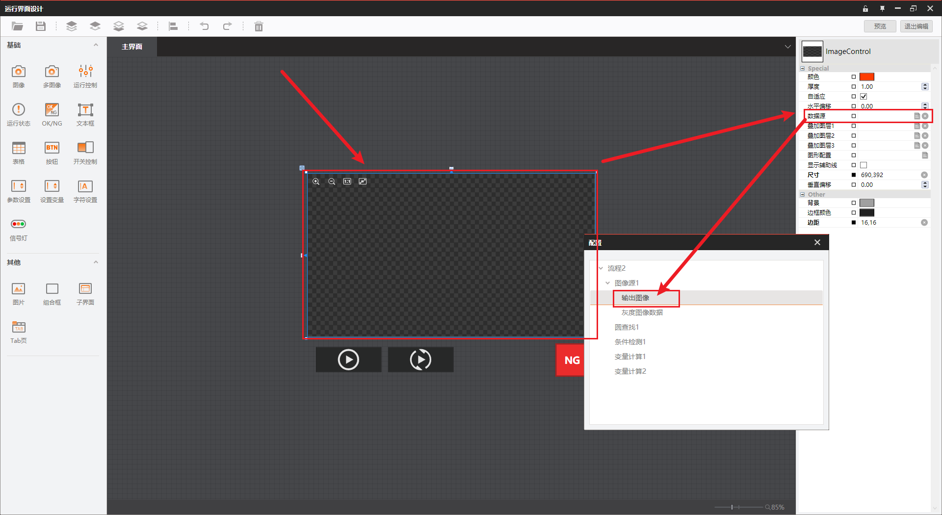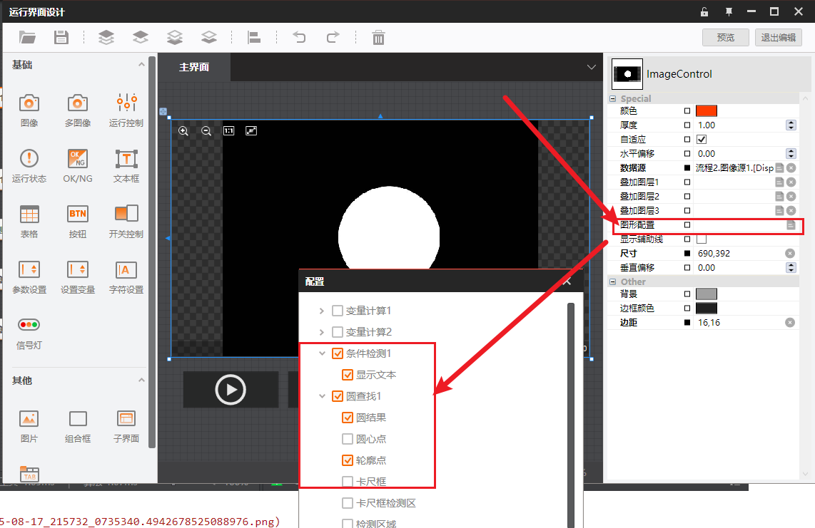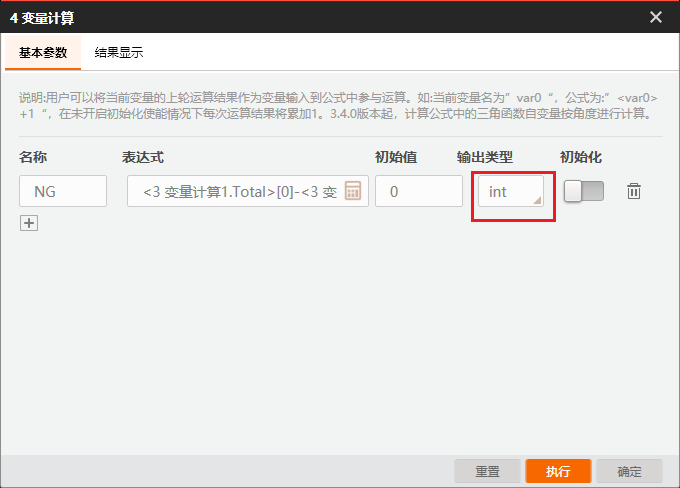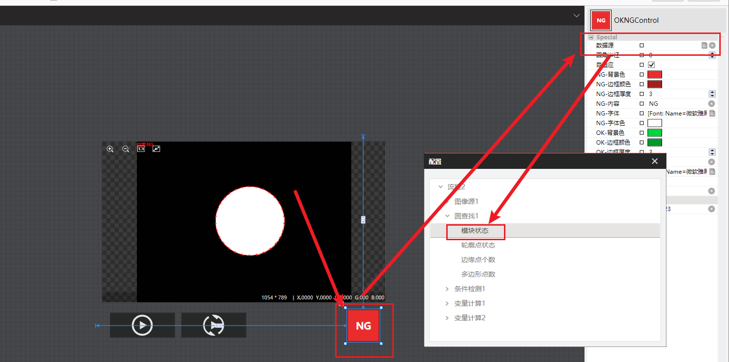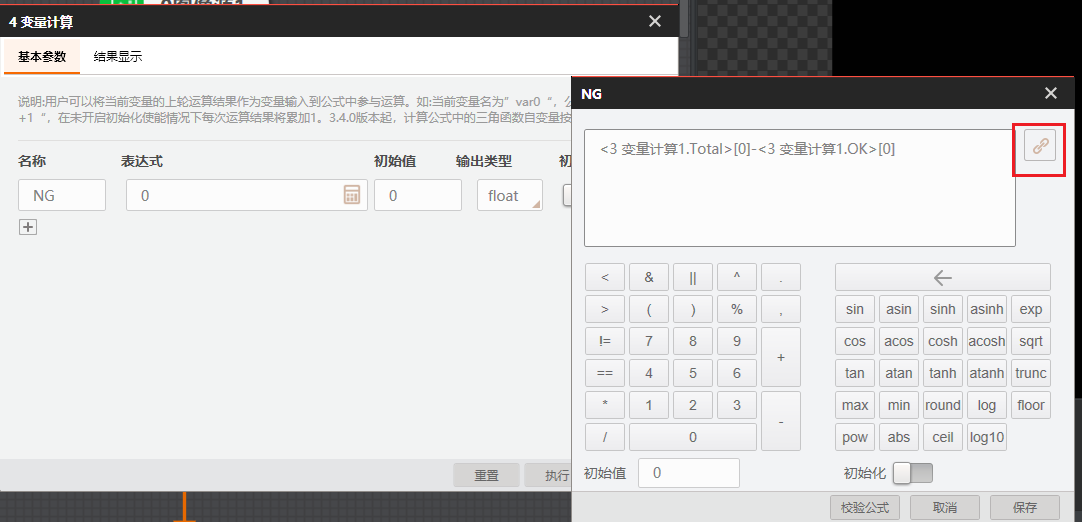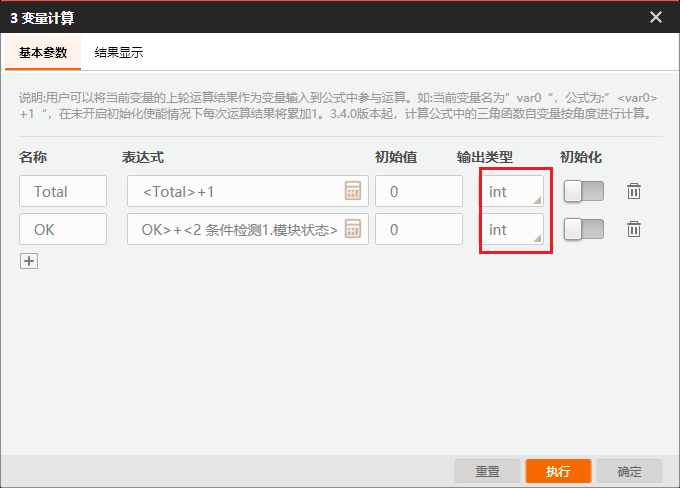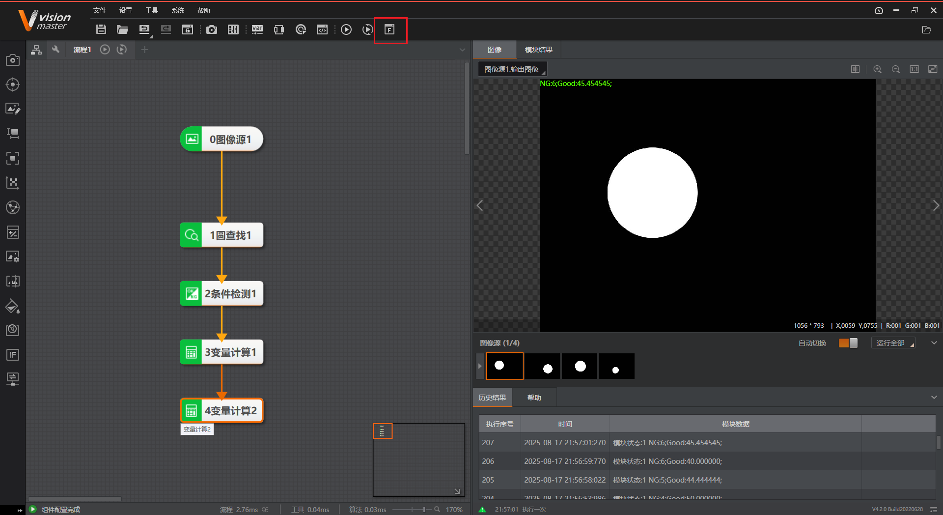 # 功能实现 对视觉方案运行的OK数和NG数进行计数和显示。 # 实现步骤 1. 根据需求搭建检测方案 2. 使用变量计算对OK、NG计数 3. 使用运行界面实时显示OK NG数 4. 重置运行界面上的OK NG数 # 示例 * 将方案执行的OK/NG数、检测数、合格率实时显示在运行界面上 * 根据生产需求,重置OK、NG数等。 # 预览  # 圆查找    # 条件检测  # 变量计算1   # 变量计算2    # 搭建界面  ## 编辑页面         # 效果图  # 导出